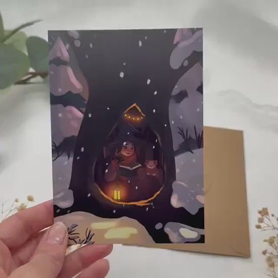 Inmitten des verschneiten Waldes sitzt eine Hexe in ihrem Baumhaus, eingehüllt in Wärme und Licht. Neben ihr ein treuer Begleiter, ein Buch in der Hand, draußen tanzen leise Schneeflocken.