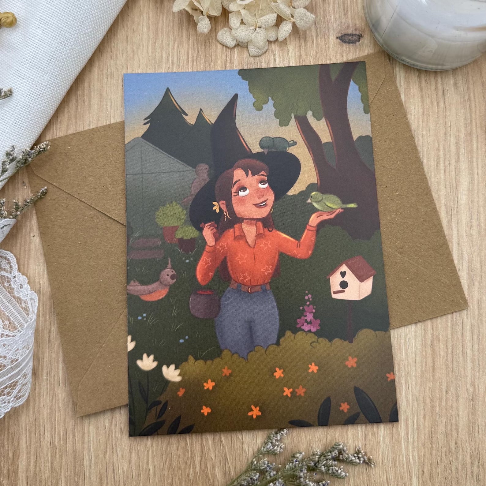 Eine kleine Hexe genießt die Gartenarbeit und lauscht den Vögeln. Diese Postkarte lädt zum Innehalten ein – ideal für alle, die Achtsamkeit und Natur lieben.