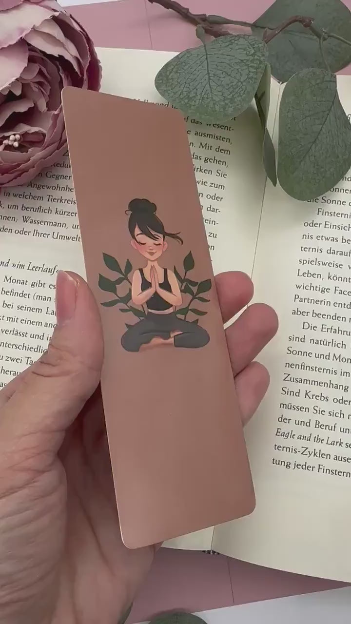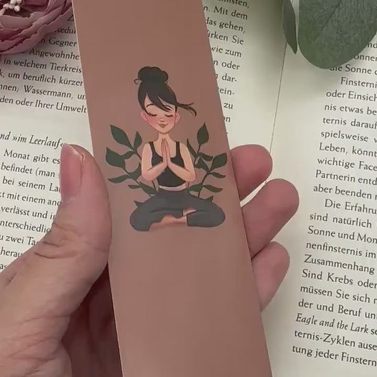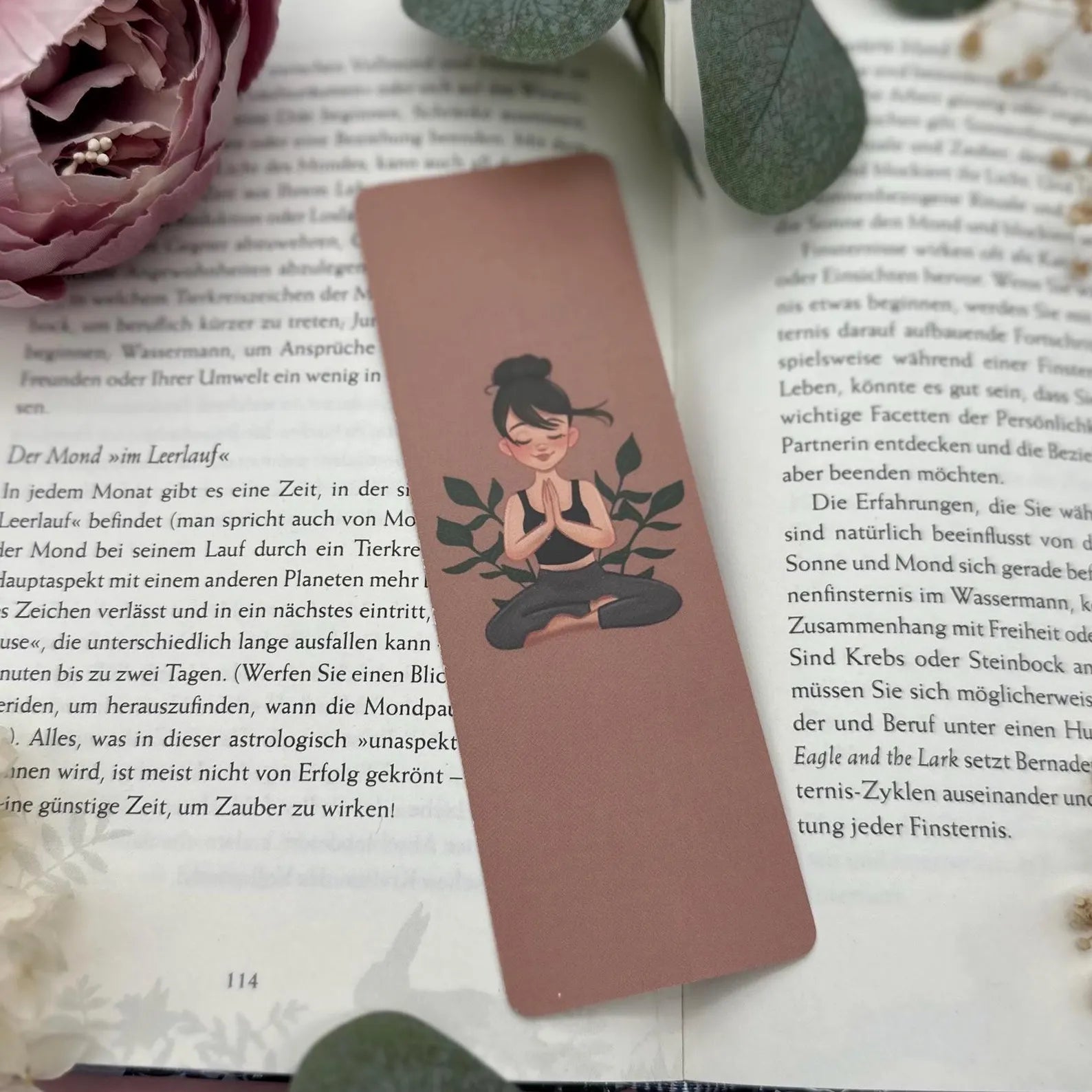 Dieses liebevoll gestaltete Lesezeichen zeigt eine friedliche Yogapose – perfekt für alle, die Entspannung beim Lesen und im Alltag suchen.