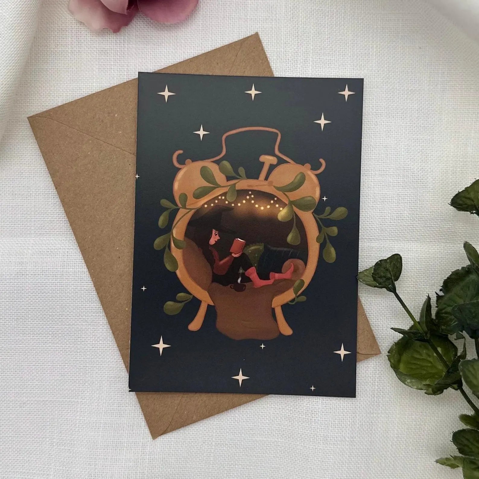 Magische Wecker - Postkarte - Hexe beim Lesen - Achtsamkeit und Zeit für dich