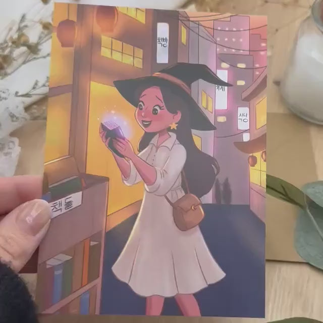 Diese liebevoll illustrierte Postkarte zeigt eine Hexe, die in einer verwinkelten, warm erleuchteten Gasse ein geheimnisvolles Buch entdeckt. Zwischen Lichtern, Laternen und japanisch angehauchten Fassaden liegt ein Hauch von Zauber in der Luft – ein Moment voller Neugier, Magie und sanfter Abendruhe.