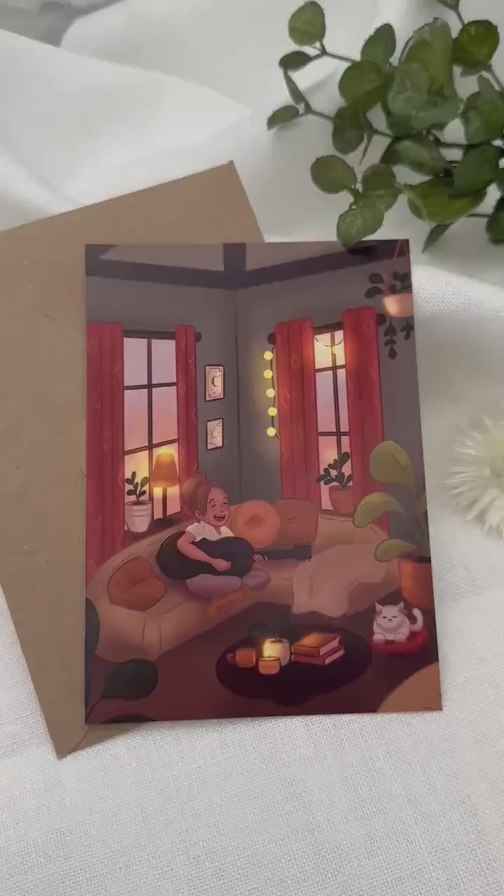 Diese Postkarte zeigt einen cozy Moment voller Leidenschaft… und eine Katze, die das ganz anders sieht.