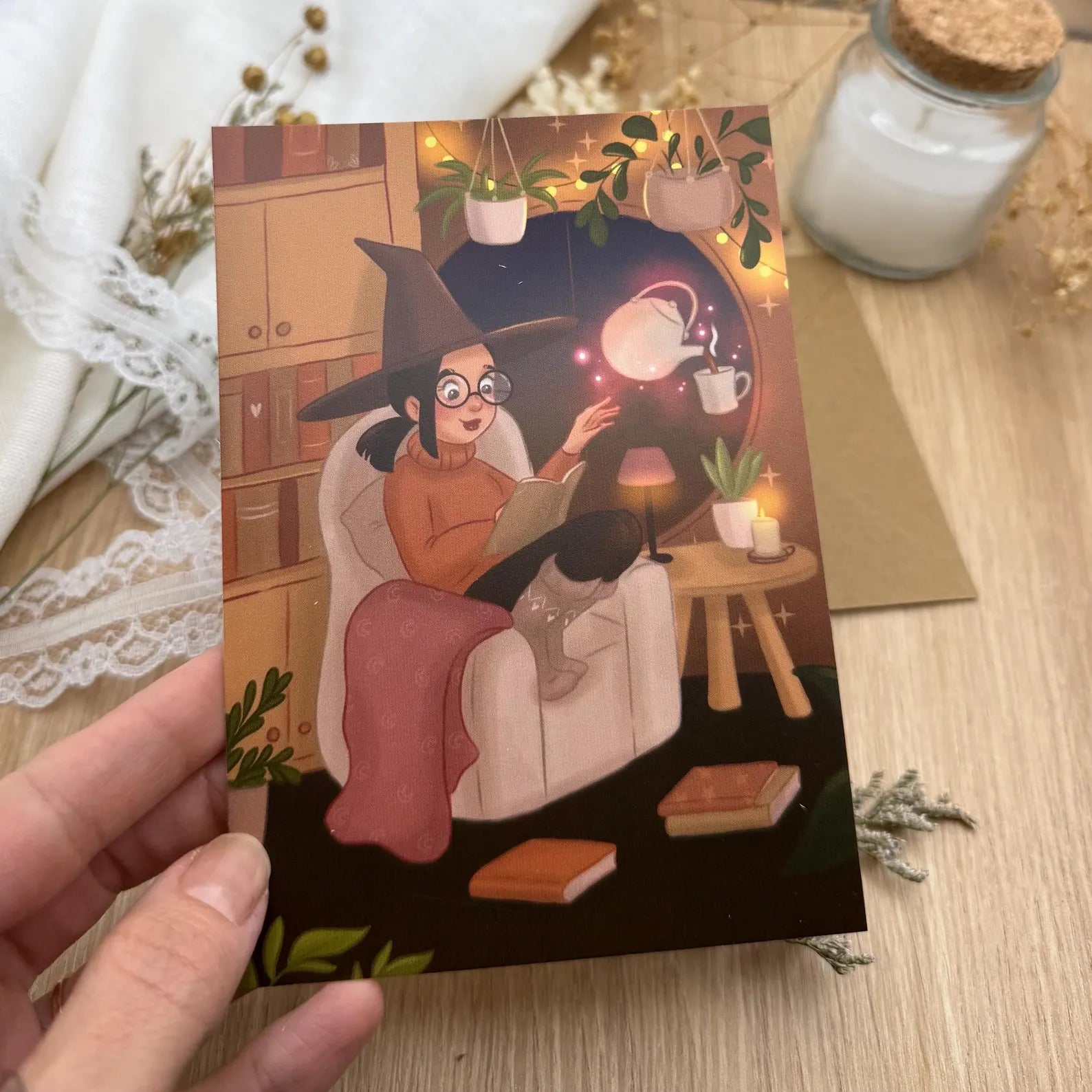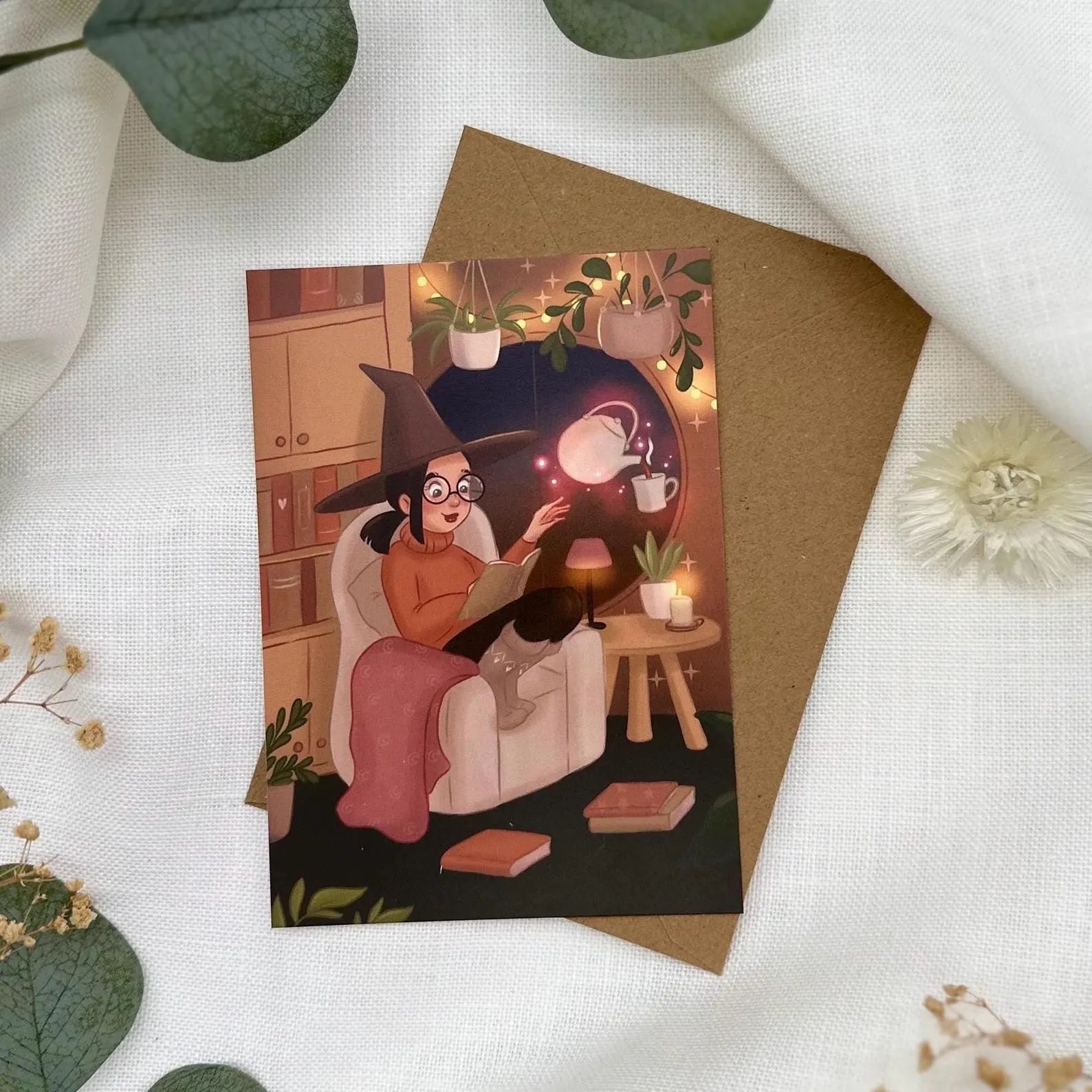 Postkarte Hexe mit Tee und Buch- Bücherwurm Illustration A6 | MoonElly Cozy Magic