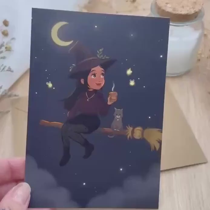 Postkarte Hexe unter dem Mond – Magische Illustration, Hexen Kunst, Halloween Karte, DIN A6