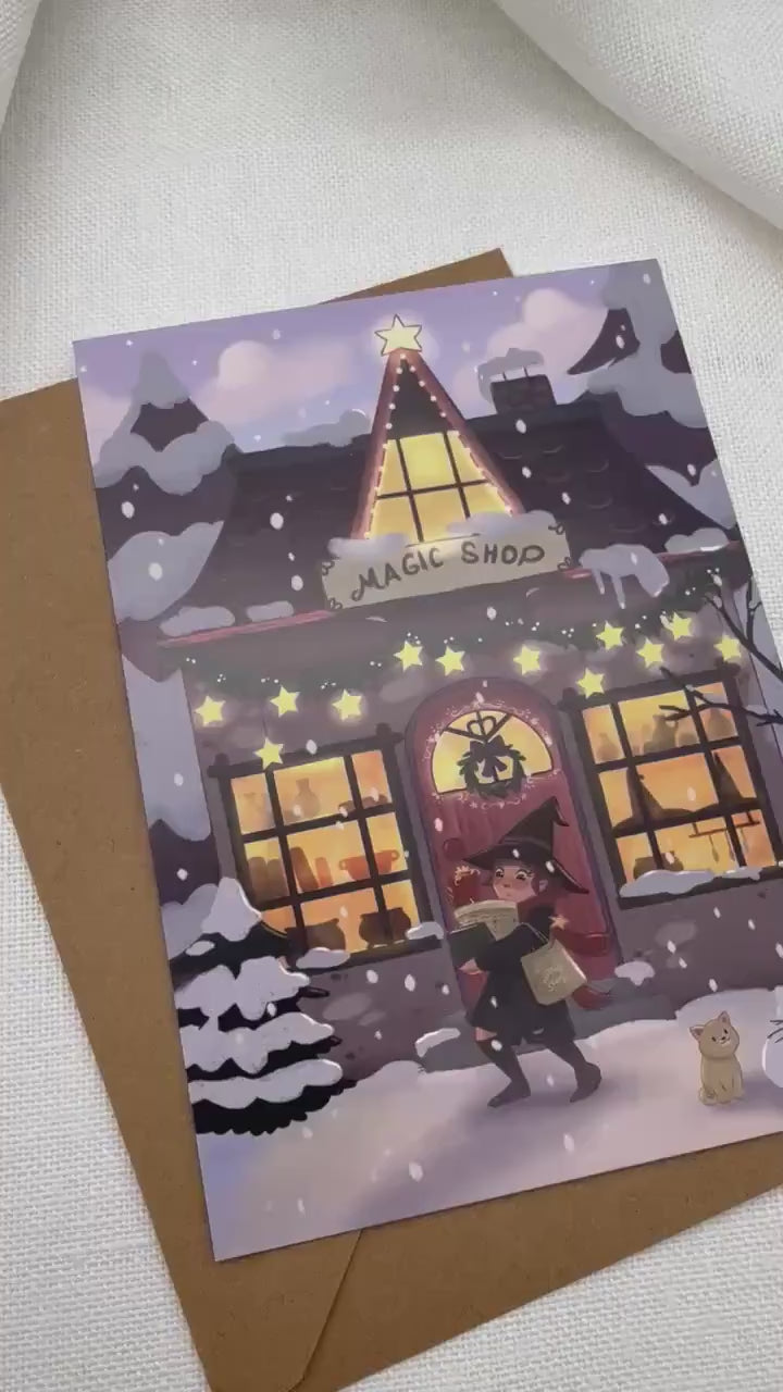 Ein Hauch von Magie im Winter – diese liebevoll von mir illustrierte Postkarte zeigt eine Hexe, die vor einem warm leuchtenden „Magic Shop“ durch den Schnee stapft, begleitet von ihrer Katze. Perfekt, um in der kalten Jahreszeit Grüße voller Zauber zu verschicken oder als Dekoration für dein Zuhause.
