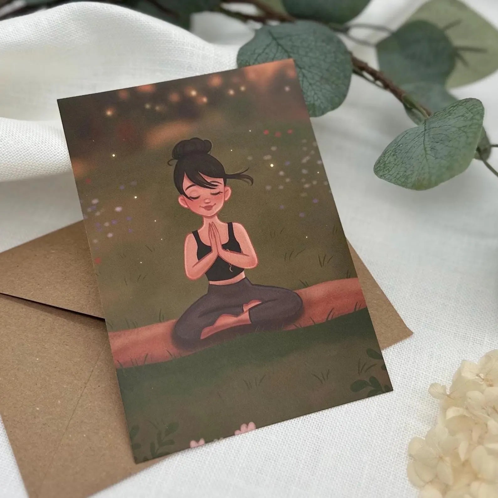 Diese stimmungsvolle Postkarte zeigt eine Yogini in tiefer Verbundenheit mit der Natur – ein Moment der Ruhe und Selbstfürsorge, eingefangen in sanften Farben und liebevollen Details.